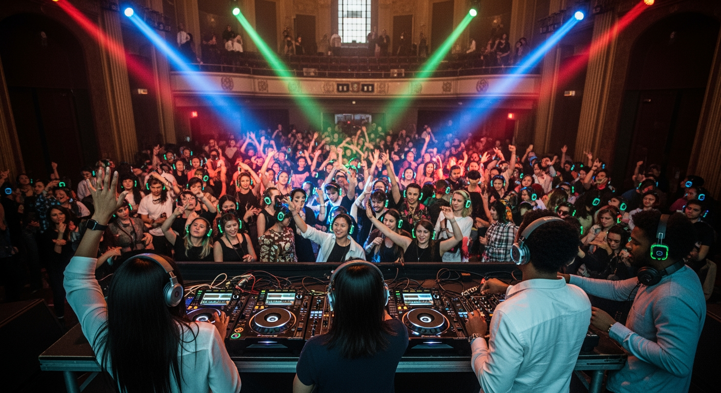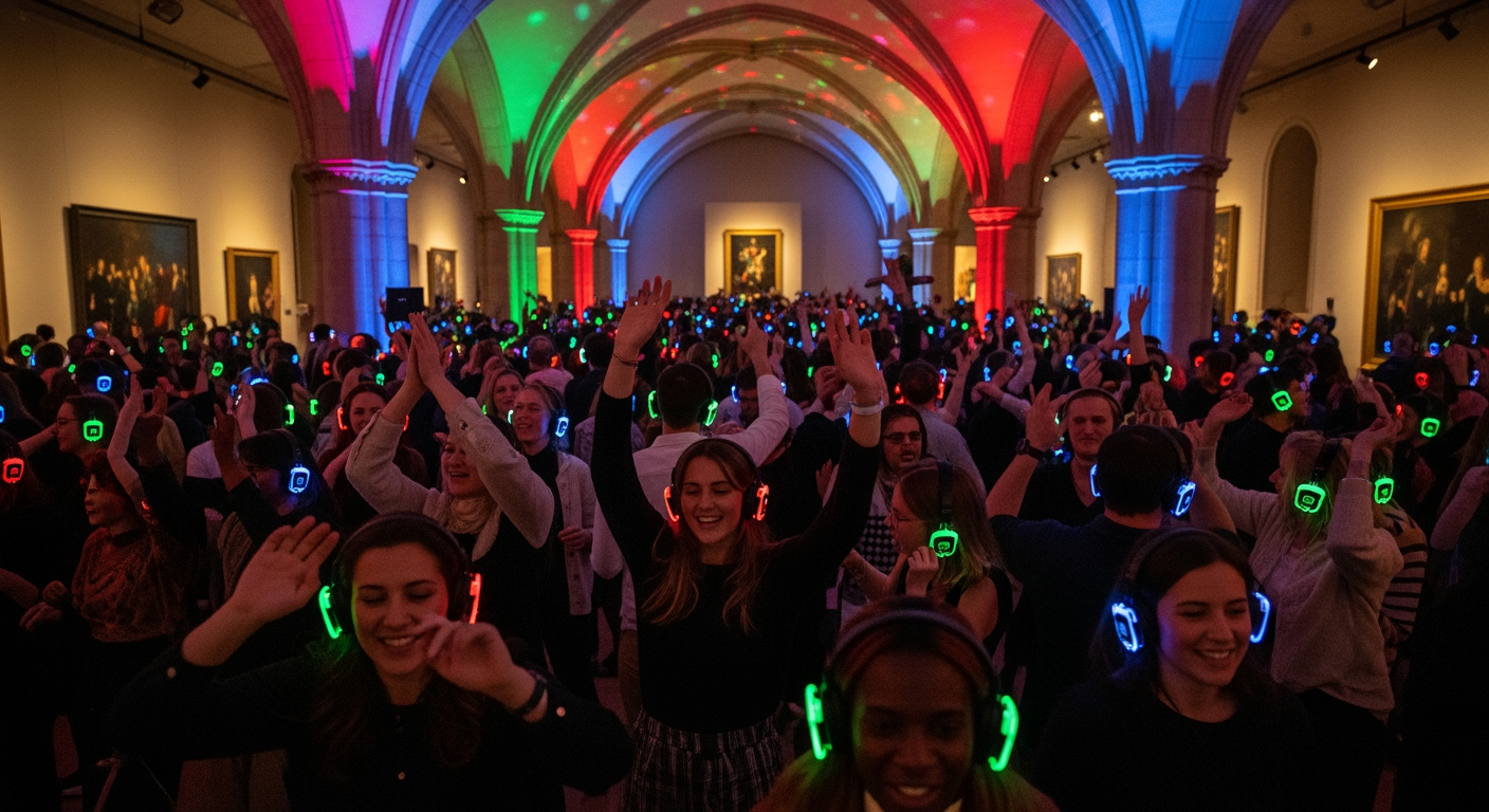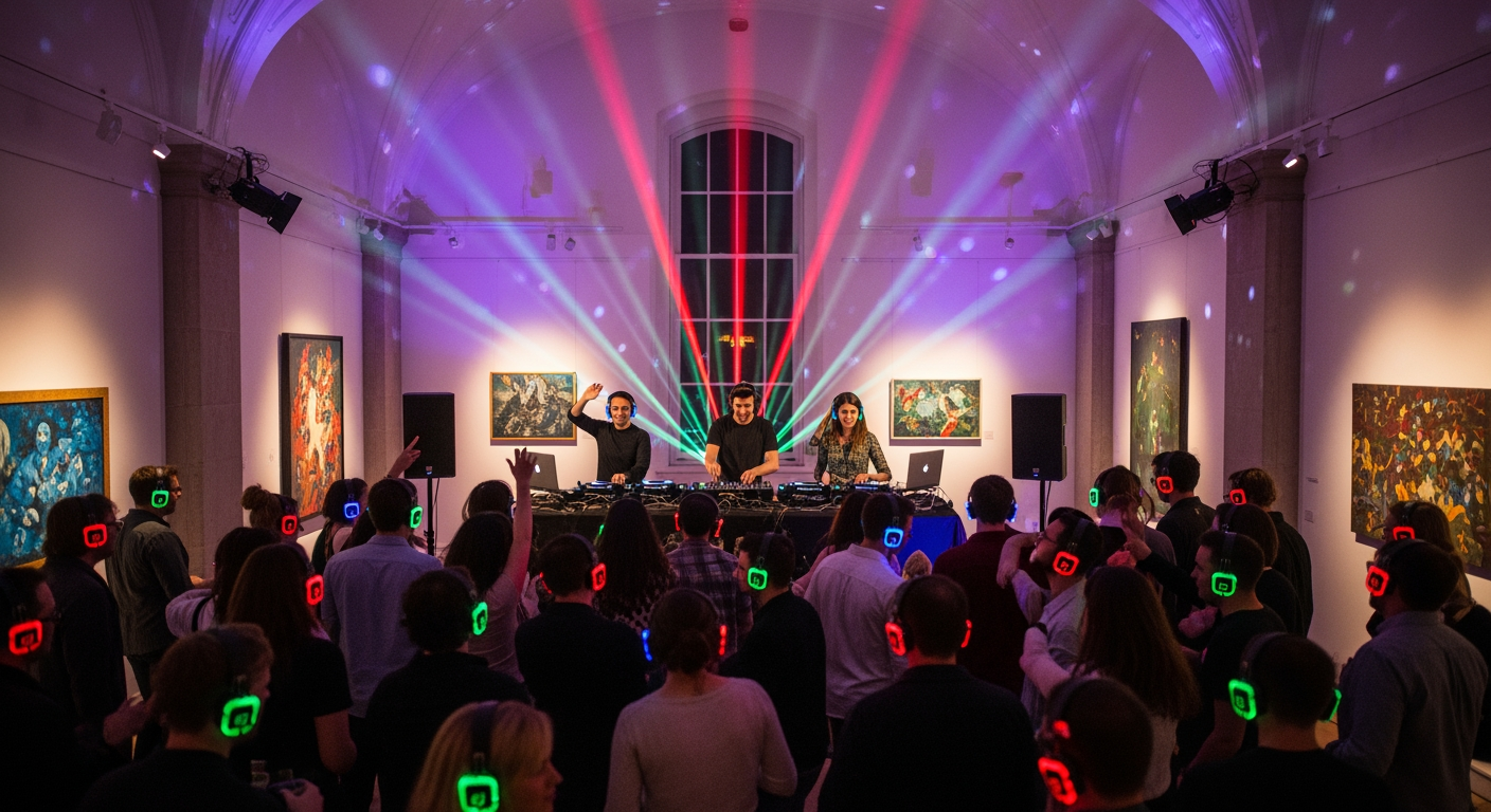 Basically, it’s a silent disco for people with cultivated electronic & dance music sensibilities, where disco / club standards are replaced by discerning gourmet beats, & standard club spaces are substituted with immersively-lit, architectural environments.